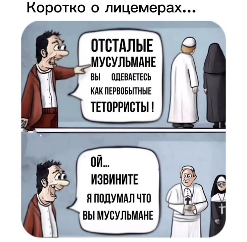 А вы вспомните как раньше платочки носили девочки маленькие. Забыли ? Хиджаб не пришло от Ислама. Хиджаб было до нас. Даже во время Христианского времени. Я видела как по религии живут христиане. И как современные батюшки. Жены с ботексом, в мини юбке, сам бородатый, в шортах. 🤷♀️ Когда между собой разговаривали услышала как говорили что его жена не порядочно ходит имея 8-9 детей и взрослых еще. Ну что ж ты можешь сказать жене, если ты сам отошел от своей веры. Сын сказал ему что да пап век такой. Надо двигаться дальше. 🤣А он ему даже не папа родной. А отец его жены 🤣